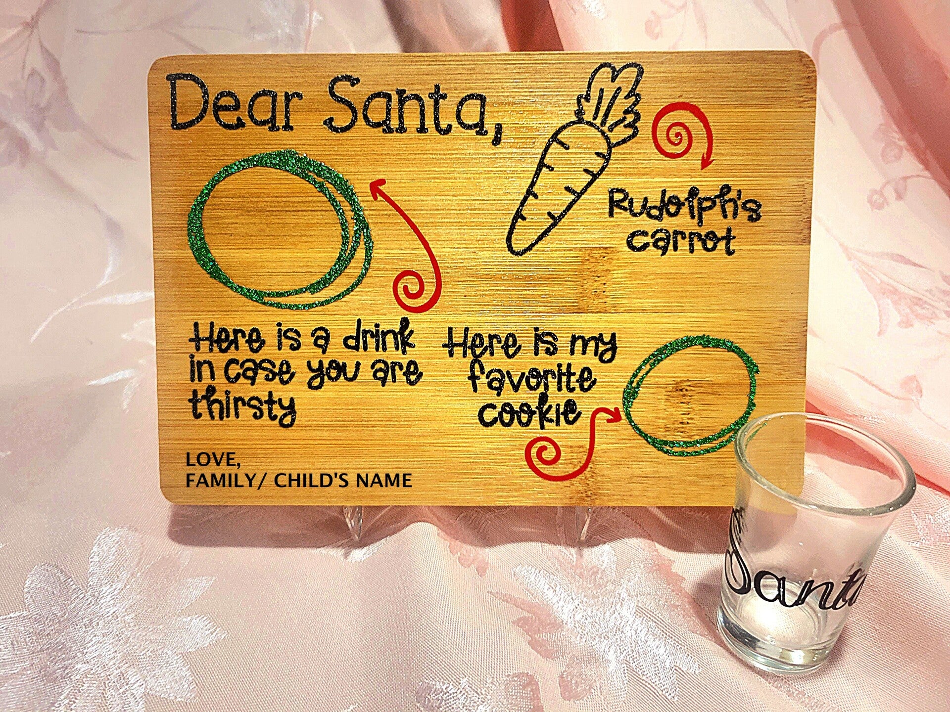 These can be Laser etched engraved or done in colored vinyl. We also include a Santa shot glass for his "milk"